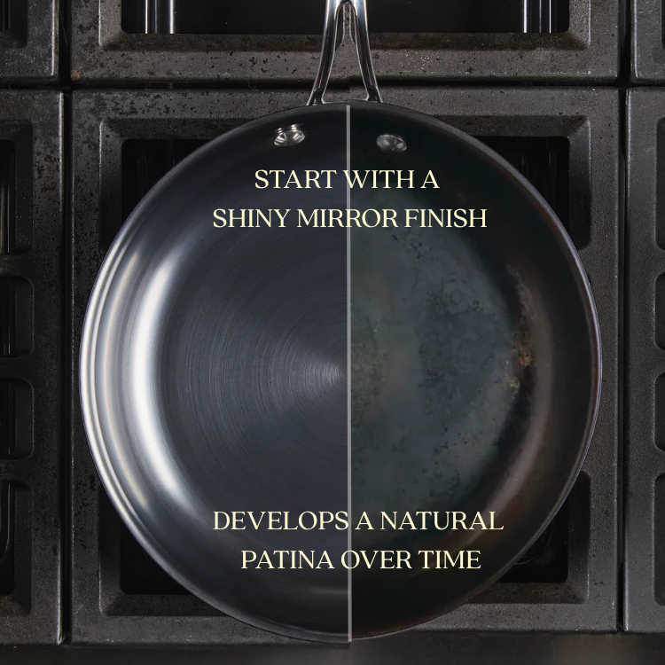 N₂ Carbon Steel is ready to use straight out of the box – no maintenance, no learning curve, and no fussy seasoning before or after cooking. Its surface darkens, strengthens, and develops a natural patina that becomes more nonstick over time.