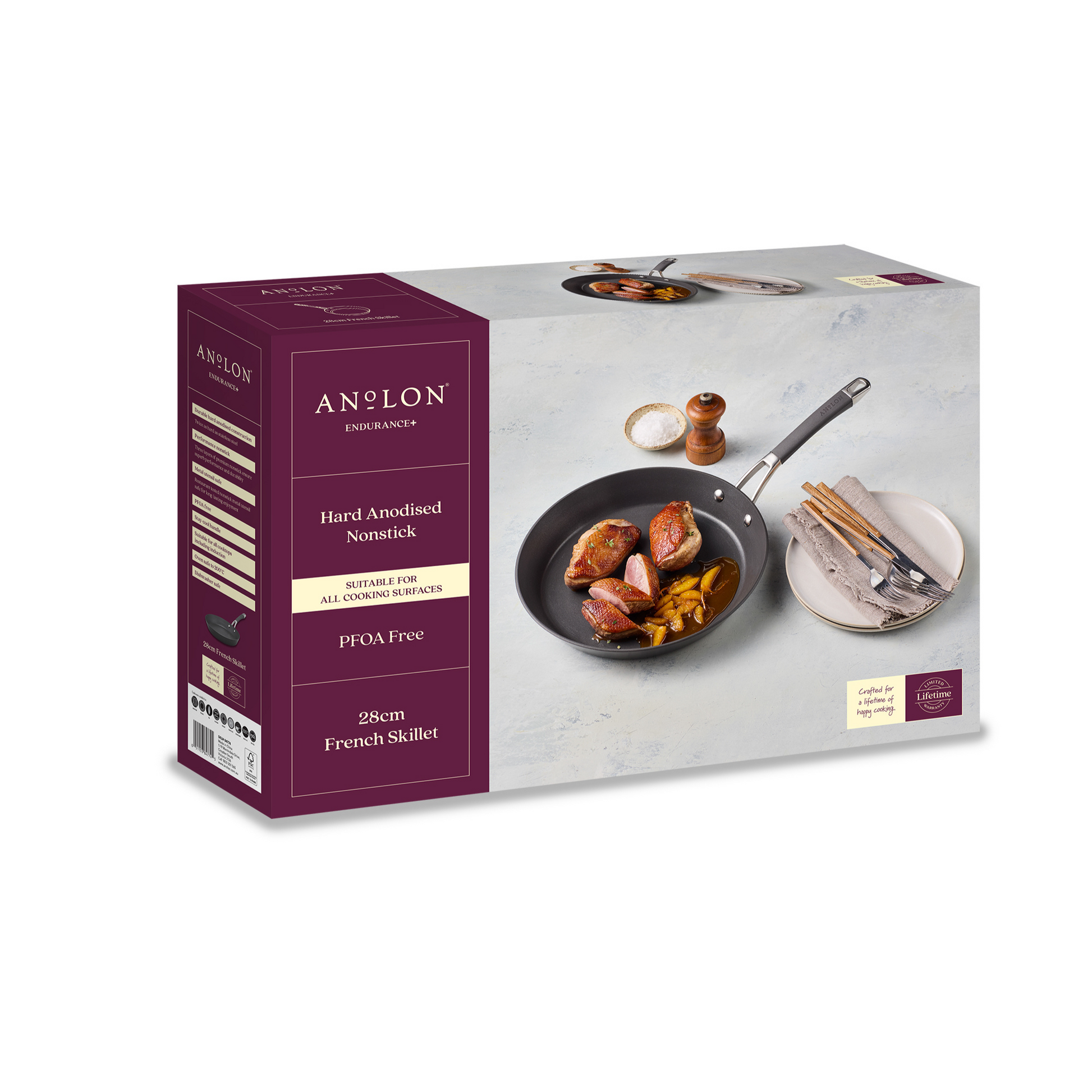 Endurance+ is perfect for everyday cooking. With a hard-anodised construction, it is twice as strong as stainless steel and it offers fast, even heat distribution. Compatible with all cooktops (including induction), oven safe to 200°C, and dishwasher safe.