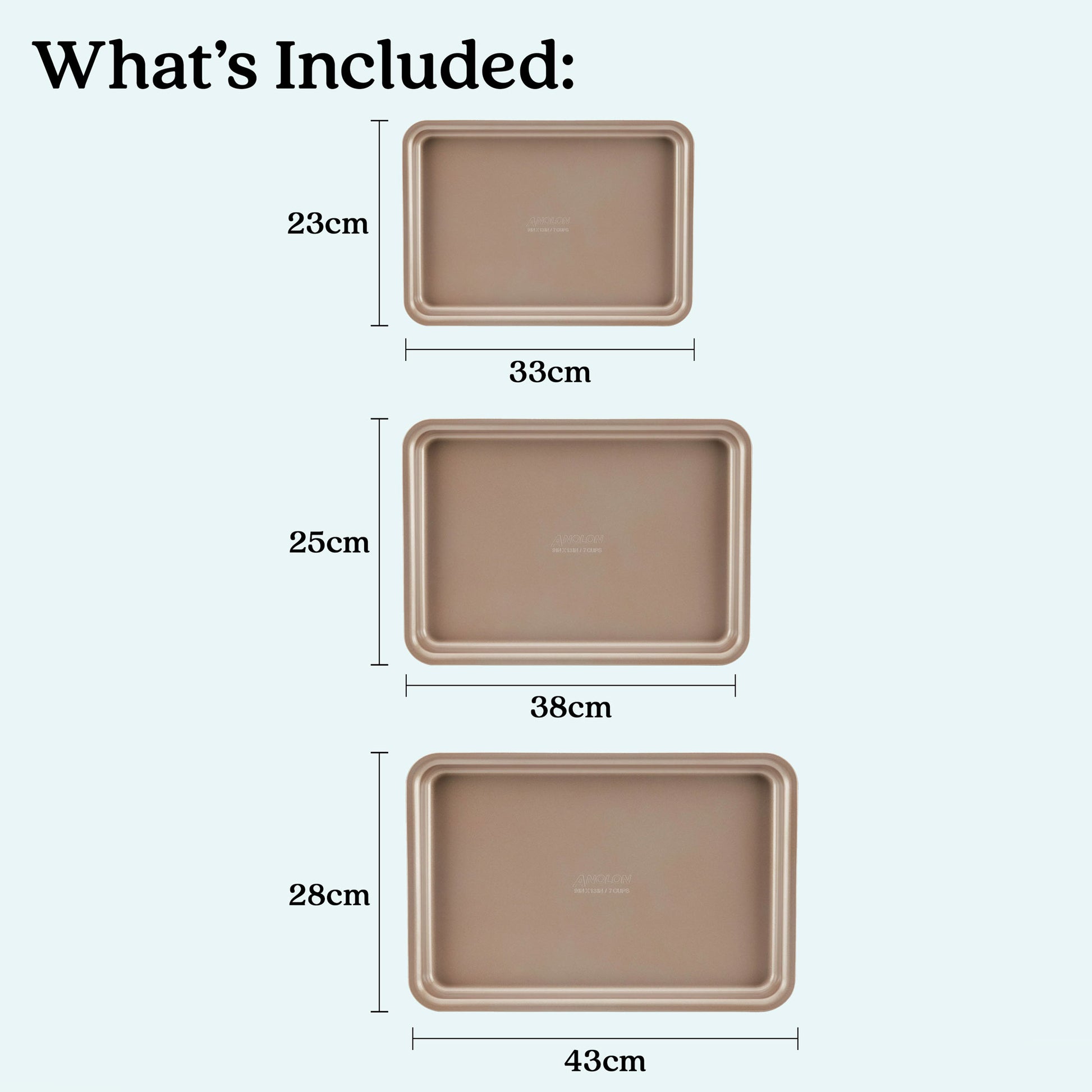 - Versatile 3 piece set includes three differently sized pans, providing flexibility for high-heat baking and roasting.