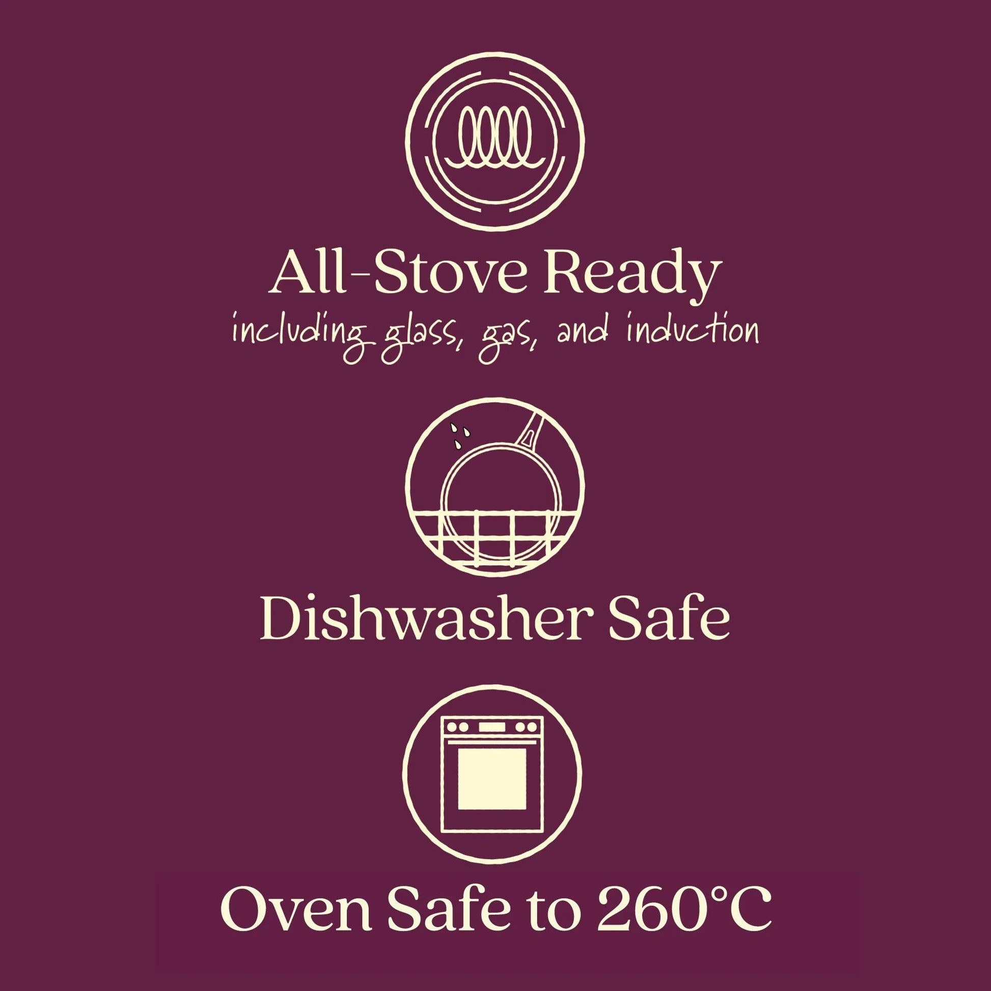 The 24cm/6.2L Covered Stockpot is perfect for boiling pasta, making soups, or cooking large meals. Works on all stovetops (including induction), oven safe up to 260°C and dishwasher safe.